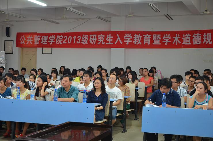 2013级研究生入学教育暨学术道德规范讲座在北区综合楼201室隆重举行。院长李江风教授、副院长才惠莲教授,以及研究生秘书杨昭琦老师、研究生辅导员郭玉凤老师等出席。会议由院党委副书记胡文勤老师主持。