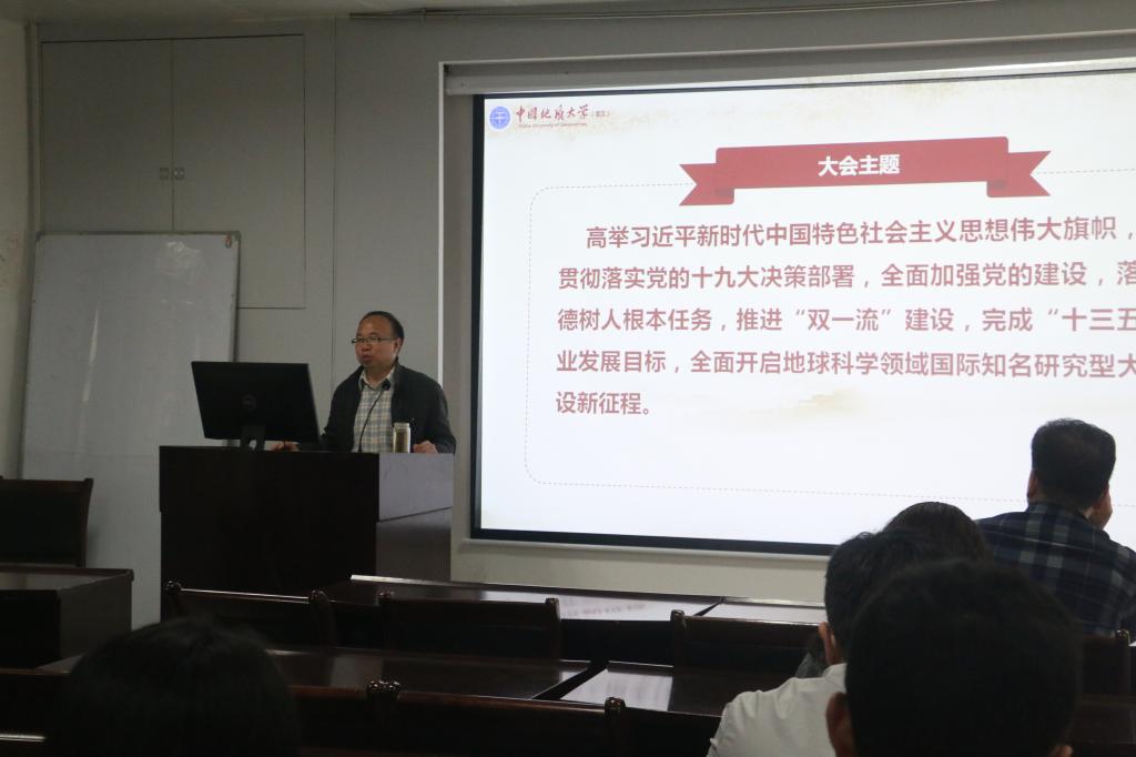 接下来,张书记对学校十二次党代会的主要会议内容进行了详细讲解,指出学校此次党代会报告突出强调了坚持和加强党的全面领导,学校要把方向聚合力发挥党委核心作用,在办学治校上要抓全局谋发展,通过强特色重内涵来增强核心竞争力。大会分析了学校事业发展新阶段的主要矛盾,提出了地球科学领域国际知名研究型大学建设新阶段的主攻方向、奋斗目标和路线图,明确了学校今后五年党的建设、思想政治工作和改革发展的主要任务,提出了全面加强党的建设、全面加强思想政治工作和全面深化综合改革的明确思路。在未来学校的发展方面,张书记传达道:下一个发展阶段学校将从人才培养、学科建设、人事人才制度、科研创新机制、治理体系等方面进行深化改革,同时还要深化大学文化内涵建设,全面提升学校发展软实力,从而为建设研究型大学提供强大内升动力;加强思想教育工作,为研究型大学建设提供正确思想引领;加强对领导班子和干部队伍、基层党组织的建设,深入推进从严治党,从而为建设研究型大学提供全方位坚强保证。