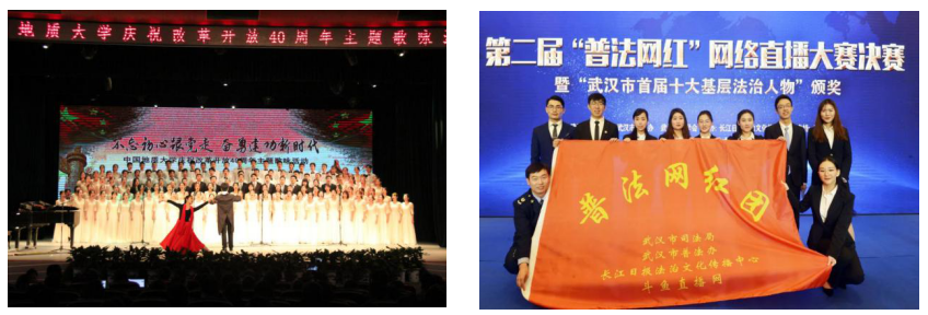 原创话剧“大地之光”。学院荣获学校“纪念改革开放40周年”主题歌咏比赛“最佳表演奖”。学院辩论队荣获华中地区“政管杯”辩论赛冠军。荣摘第二届全国“普法网红”网络直播大赛(辩论赛选拔赛)桂冠,2018级硕士生赵淼峰、2016级本科生任雨晴荣膺“武汉市普法形象大使”。