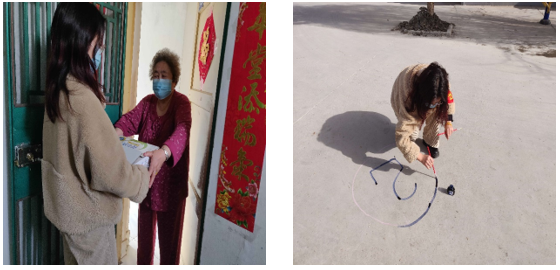 预备党员邵迪向社区独居老人送生活必需品   预备党员邵迪在地上勾画排队买菜位置点