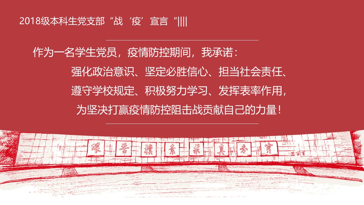 一句承诺见初心,一句誓言践使命。支部党员结合党中央及学校党委要求,起草完成支部战“疫”宣言,面对宣言,支部书记吴波线上领读,支部党员线上集体跟读,写上自己的名字,发出自己的声音,践行自己的承诺,向同学们发出号召。