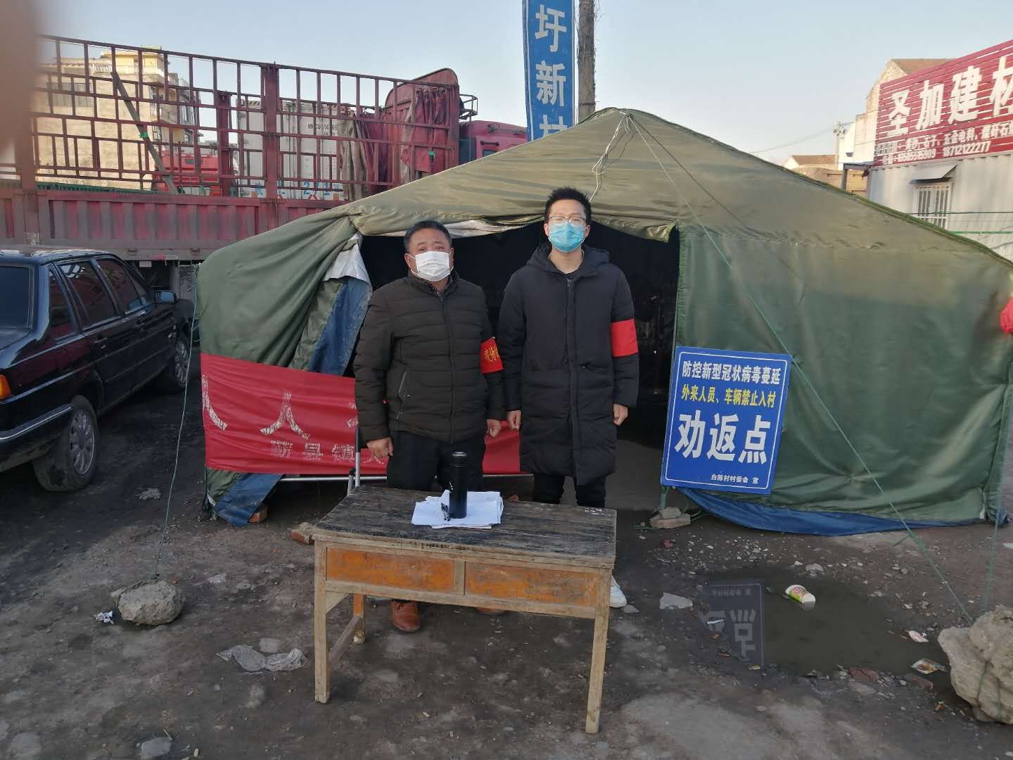 预备党员陈泽贤在村口执勤点负责人员出入登记