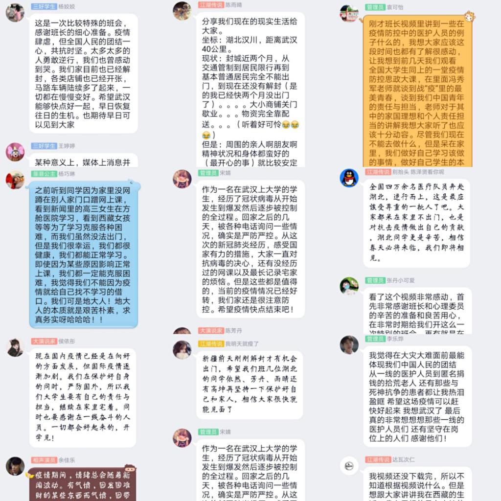 (通讯员 张依然)2020312日,武汉封城的第51天,由于新冠肺炎疫情,我们不得不以这样的形式召开本学期第一次班会,这也会成为大学四年里最特殊的一次班会。此次班会采用录屏直播形式,由班长和心委员主持,172182全体成员参与,黄砺老师作为嘉宾参与了会议。