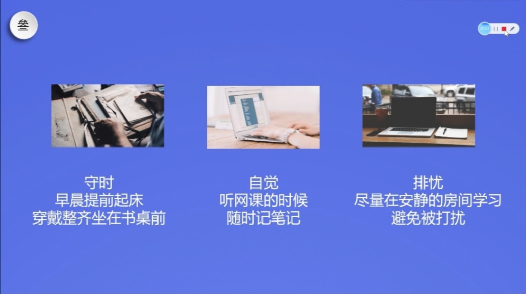 云端学习,更需要我们自主、自律,不只是生活,学习也需要仪式感。我们可以定好闹钟,提醒自己上课时间到了;早早地起床,坐在书桌旁上课;预习新课程;认真完后才能作业;坚持阅读……