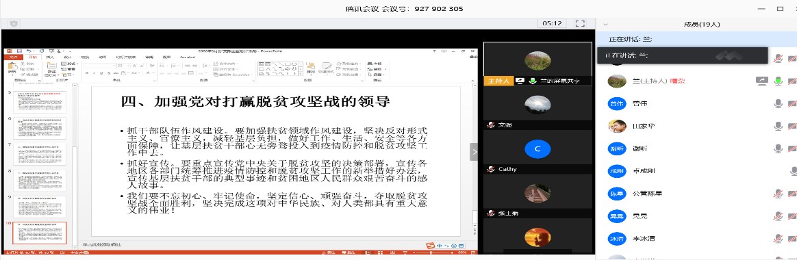 (通讯员:刘中兰)2020326日下午两点,公共行政系利用腾讯会议方式,开展“坚持不懈坚决打赢疫情防控和扶贫攻坚阻击战”主题党日学习活动。活动由系支部书记刘中兰主持,全系党员教师积极参加主题学习活动。