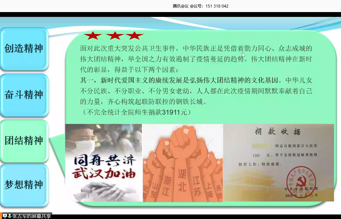 张吉军书记的“微党课”让广大教师党员更加全面地了解了抗疫过程,对民族精神有了更深刻的认识。参会党员表示,这堂精彩的“微党课”中的人物既有新闻事件中的主角也有来自我们身边的榜样,从这些身边人身边事中,我们受到了鼓舞和洗礼,更加坚定了坚持党的集中统一领导,坚持全国一盘棋,坚持群策群力办大事的制度自信,更加牢固地树立起人民利益高于一切的宗旨意识和为党育人为国育才的初心使命。