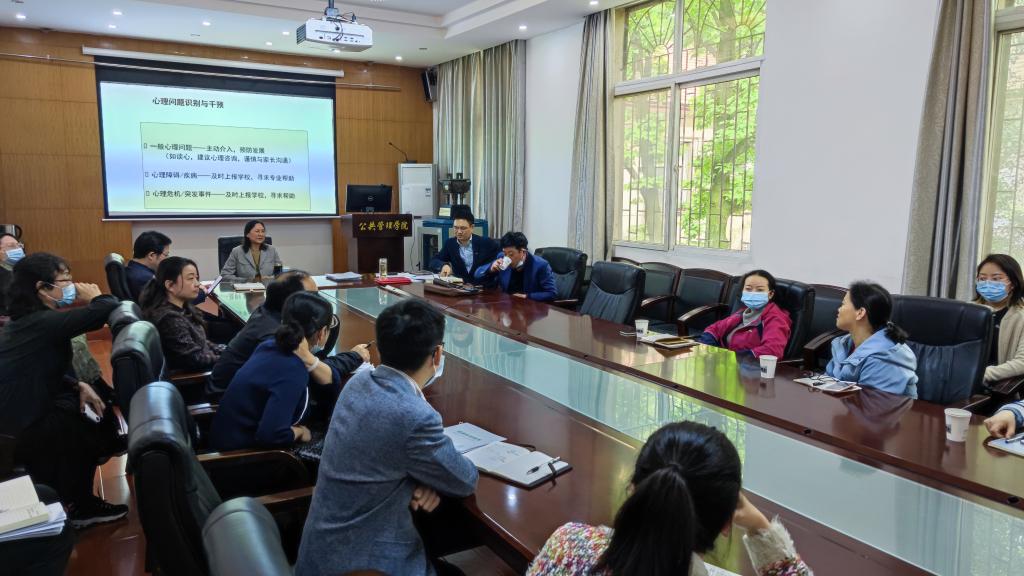 会议第一项,学生心理健康教育中心郭兰教授进行培训。郭兰教授围绕班主任如何做好心理健康教育工作进行讲授,通过在学生心理健康教育中心的指导咨询情况,讲述了心理健康教育工作的重要性,并对心理正常和心理异常做了对比分析;通过实际案例讲解了心理困扰、心理障碍、心理危机三者的判别标准,指出有自知、有主业、有朋友、有价值、有效率、有担当是心理健康的常见标志,可以通过自我觉察、他人观察进行预防。郭教授随后进行了心理健康工作方法指导,指出班主任需要加强基本知识学习,可以通过班会、谈话走访等了解学生特点,与学生建立良好的师生互信关系,需要用好学生骨干,明确关注对象,与辅导员一起形成心理健康工作合力。最后郭教授就班主任谈心谈话方法和心理问题识别与干预方法进行了具体指导,班主任们就日常工作中碰到的难点问题与郭教授进行了探讨交流。