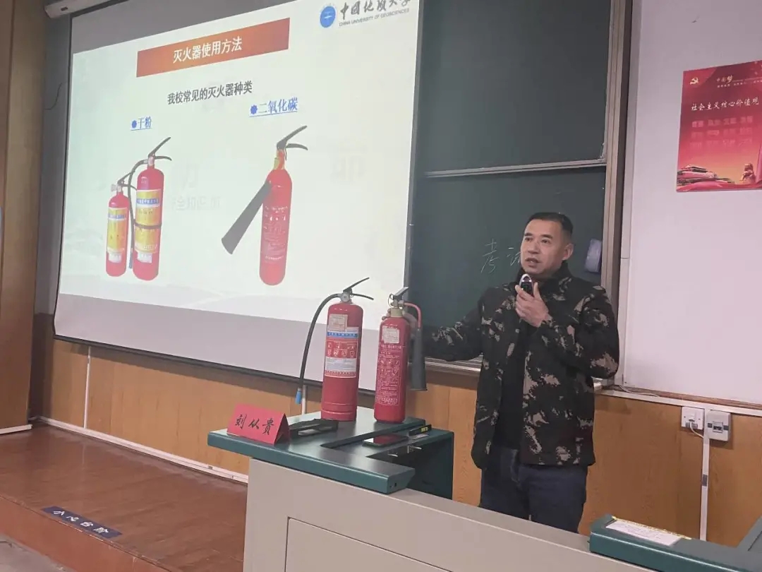 第七讲由安全保卫部消防科科长刘从贵老师主讲。他以《关注消防 珍爱生命》为题进行消防安全知识讲座,围绕形成火的三要素、现代火灾特点、学生宿舍常见火灾类型、“谁使用,谁管理,谁负责”安全工作原则、会报警、识别消防设备、遇到火灾如何逃生等内容展开讲述。他运用大量案例充分展示了火灾事故的危害性,要求同学们主动了解消防知识,耐心演示了学校两种常用灭火器适用火种及使用方法。