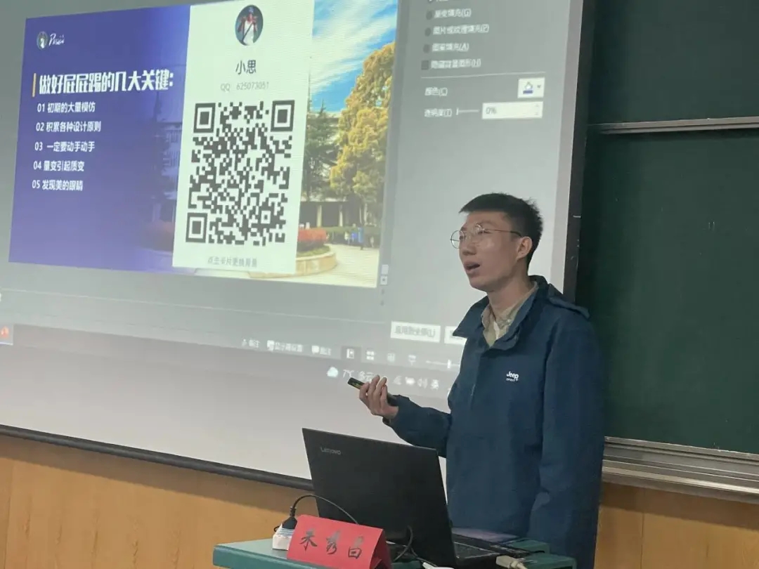 第四讲由地球科学学院2020级地表班研究生朱秀昌同学主讲。他以《讲个屁屁踢》为题进行PPT制作培训,他强调在制作幻灯片过程中须尤为重视配色、文字以及图片的和谐搭配,现场演示了一些基本操作,重点演示了布尔运算的运用、蒙版的使用以及如何利用好渐变色工具。