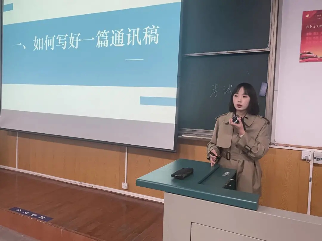 公共事业管理专业173182班韦仕莉同学主讲。她以《通讯稿撰写与人物采访》为题,就如何写好一篇通讯稿、如何做好人物采访谈了自己的实践和心得体会,分享了自己在在《中国青年报》发表的3篇推文。她重点谈了通讯稿写作结构、写作要点、注意事项、案例分析,任务采访的前期准备、采访过程、采访观察、稿件写作等主要内容,她认为好的新闻人需要不断阅读、思考、借鉴、提升,好的新闻稿件需数次修改,只有多看、多思考、多借鉴、多写才能写出高质量的文稿。