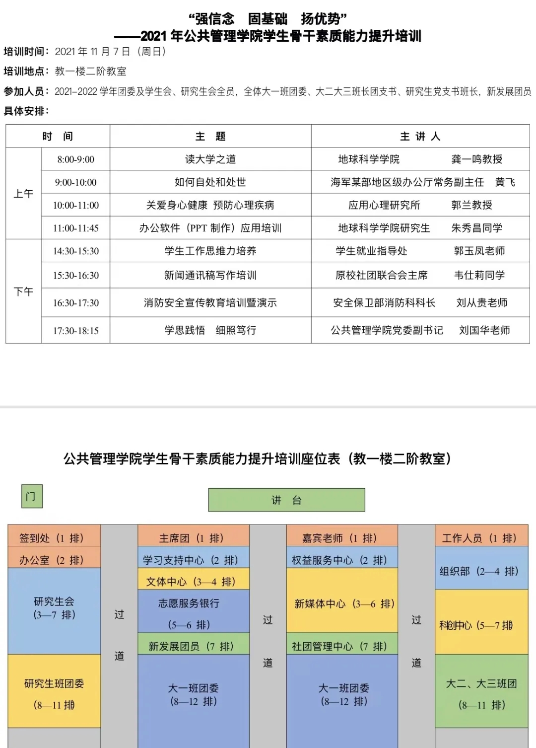“强信念 固基础 扬优势”学生骨干素质能力提升培训在西区教一楼二阶教室举行。国家教学名师龚一鸣教授、海军某部地区级办公厅常务副主任黄飞主任、心理健康教育中心郭兰教授、地球科学学院2020级地表班研究生朱秀昌同学、学生就业指导处郭玉凤老师、原校社团联合会主席173182班韦仕莉同学、安全保卫部刘从贵老师、公管学院党委副书记刘国华老师讲授了八个不同主题的专题内容。160余名2021-2022学年团委及学生会、研究生会全员、全体大一班团委,大二大三班长团支书、研究生班长党支书以及新发展团员参加培训。培训由学院党委副书记刘国华老师主持。