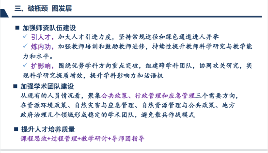 方世明老师在地质大学工作即将20个年头,他从师资队伍建设、教材建设、学术平台建设、学科体系建设等方面谈了自己未来的努力方向,表示自己有信心、有决心、有能力和土地资源管理系同事一起,为学院公共管理学科冲A贡献力量。