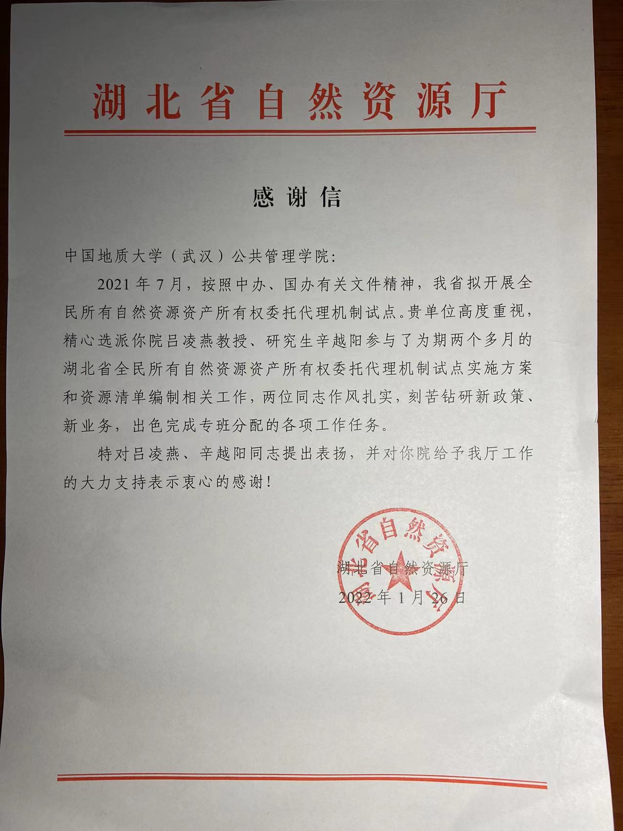 选派法学系老师吕凌燕、研究生辛越阳,参与了湖北省全民所有自然资源资产所有权委托代理机制试点实施方案和资源清单编制相关工作,两位同志作风扎实,刻苦钻研新政策、新业务,出色完成了专班分配的各项工作任务。