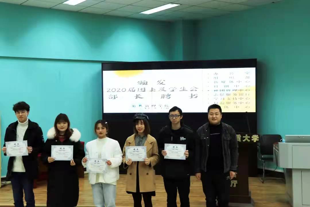 活动第一项,党委副书记刘国华老师为2020届团委及学生会主席团成员颁发聘书,学工组王青涛老师、吴波老师、王欣雨老师依次为2020届各部门部长颁发聘书。