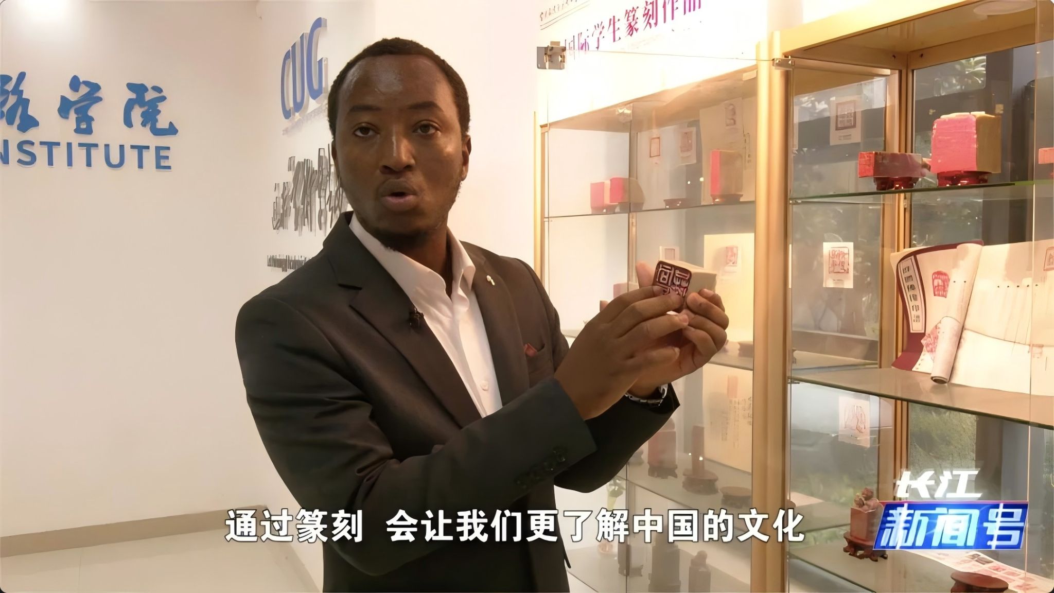 (武汉)丝绸之路学院,艾力辰介绍说,这里是他学习和生活了5年的地方。在学院一楼的展厅,陈列着国际学生们自己动手完成的篆刻印章、书法、剪纸画等中华传统文化作品。艾力辰说,中国篆刻艺术给他留下了深刻的印象,这种中国传统艺术形式很复杂,但非常有趣,通过学习篆刻,他更深刻领略到了中国文化的魅力。