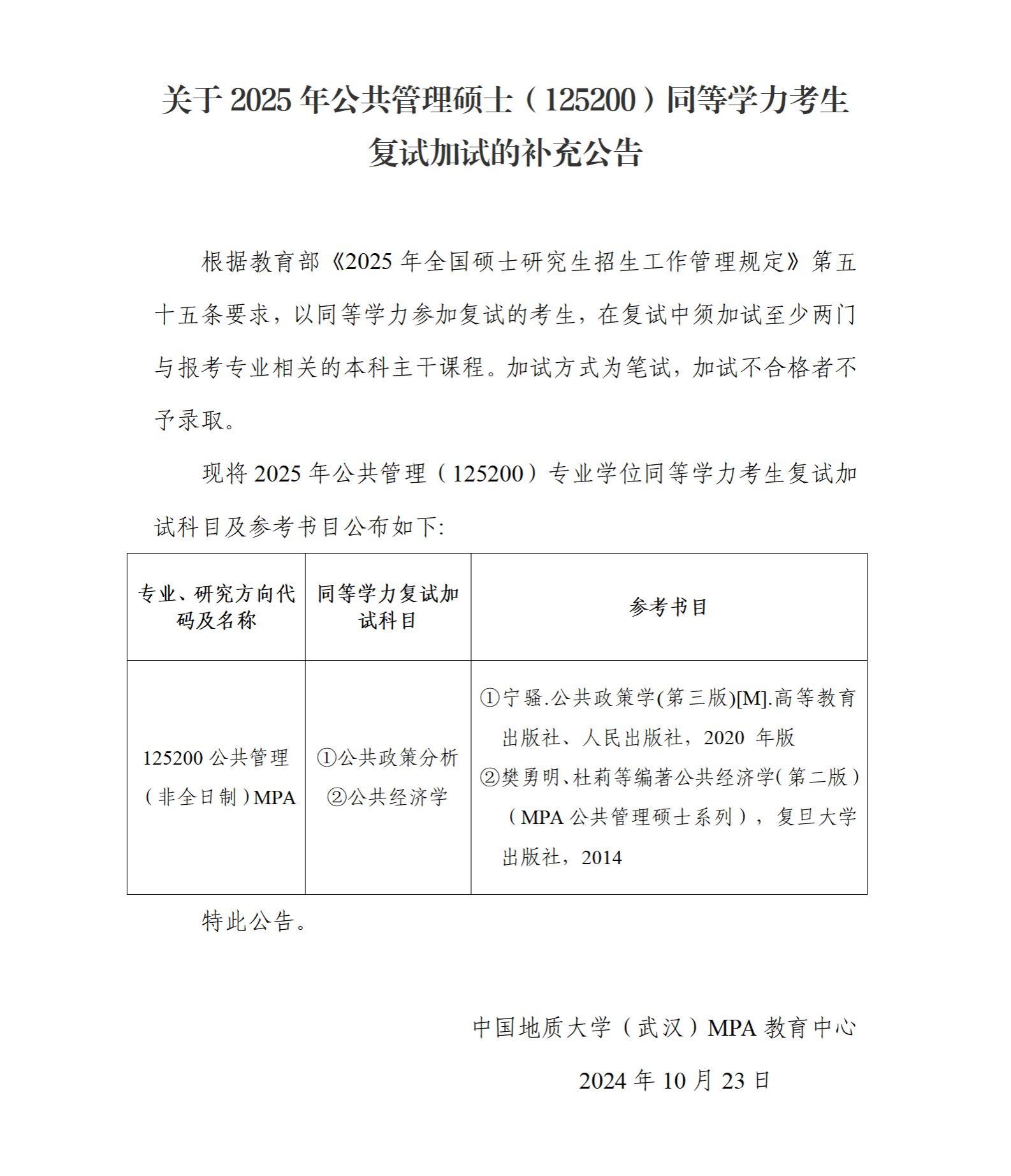关于2025年公共管理硕士(125200)同等学力考生复试加试的补充公告