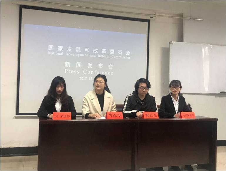 2017年,我系针对行政管理和公共事业管理专业的大三学生新开设实践类特色课程《模拟新闻发言人训练》,训练时间为1周,1个学分。该课程分为两个环节,即前期准备和后期模拟展示。在前期准备环节,学生分好组后(每个组不超过5人),按照指导老师列出的选题,利用课外时间收集整理新闻发言人相关制度、理论知识和视频资料,做一定的理论储备。比如,新闻发言人应该具备的素质和能力,发言内容与形式要求,发言要达到哪些目的,现实中的新闻发言人是如何发言的,等等。之后,剧本撰写、角色扮演、舞台策划与表演设计等由小组成员分工协作完成。在后期模拟展示环节,分小组现场模拟新闻发布会,由5位评委老师打分和点评。
