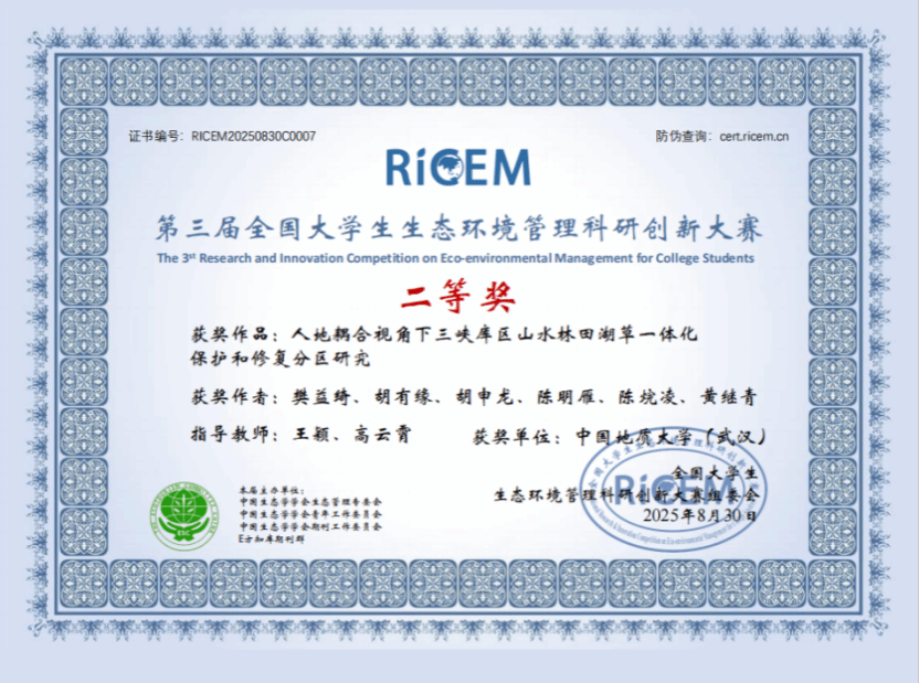 近日,第三届全国大学生生态环境管理科研创新大赛经过多轮评比,公布了比赛结果。由成人小说 王颖老师与中国科学院地理所特别研究助理高云霄老师共同指导,成人小说 学子樊益绮、胡有缘、胡申龙、陈明雁、陈烷凌及黄继青组成的“南望只此青绿”团队,凭借作品《人地耦合视角下三峡库区山水林田湖草一体化保护和修复分区研究》荣获全国二等奖。