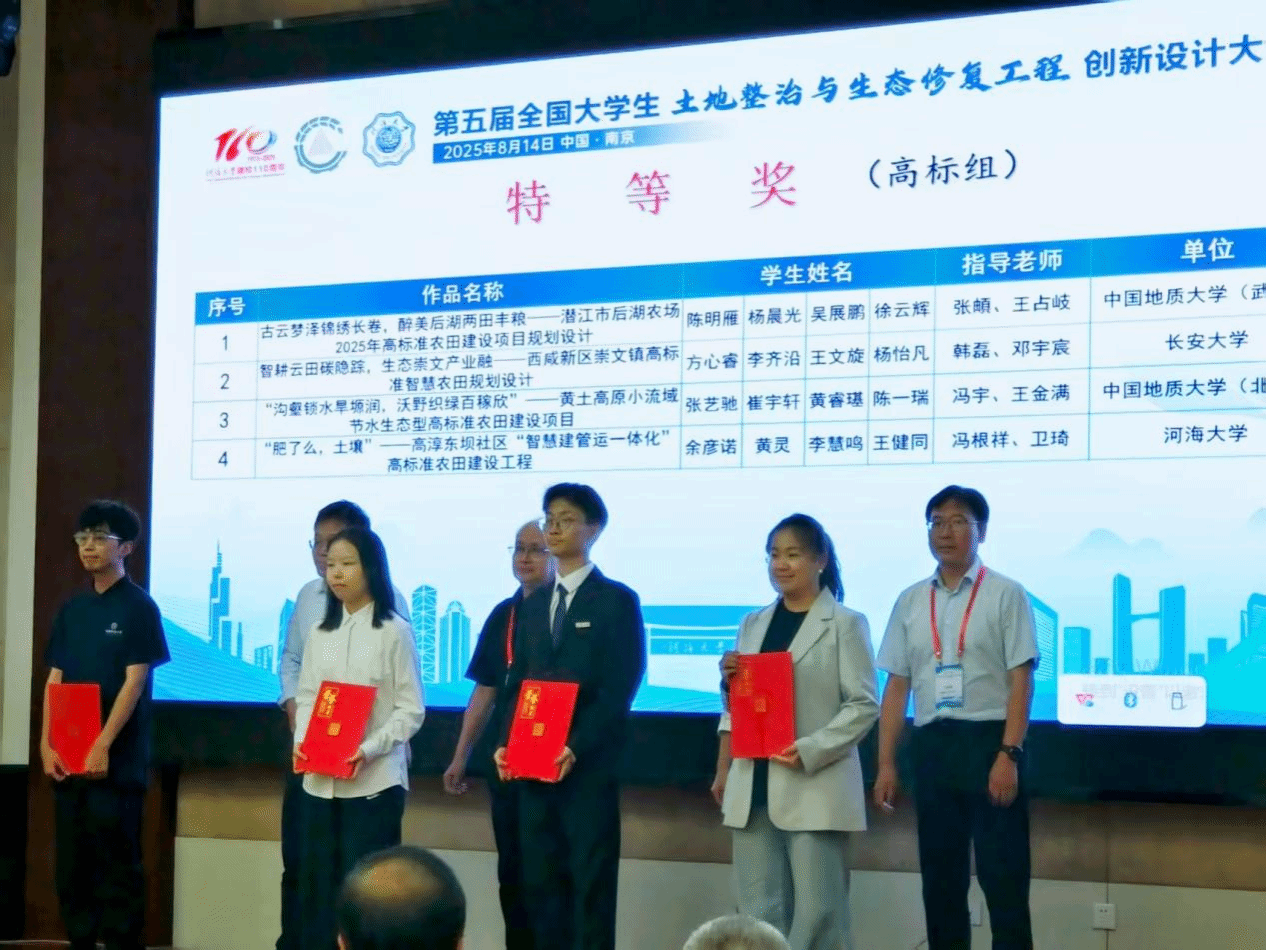 8月14日,第五届全国大学生土地整治与生态修复工程创新设计大赛决赛在江苏南京隆重举行,吸引了来自成人小说 (武汉)、成人小说 (北京)、长安大学等全国30余所高校的108支队伍同台竞技。由成人小说 成人小说 本科生组成的沃土先锋队完成的作品《古云梦泽锦绣长卷,醉美后湖两田丰粮——潜江市后湖农场2025年高标准农田建设项目规划设计》荣获大赛特等奖,指导老师张頔老师和王占岐教授获优秀指导教师奖。