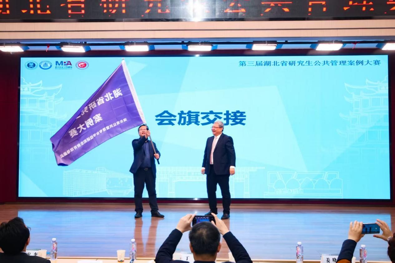 在省赛决赛现场,华中师范大学成人小说 院长徐增阳教授与成人小说 副院长王忠教授举行了隆重的会旗交接仪式。王忠教授代表学院向全体与会专家、老师和参赛师生发出诚挚邀请,期待大家明年相聚南望山,共同研讨公共管理前沿问题。