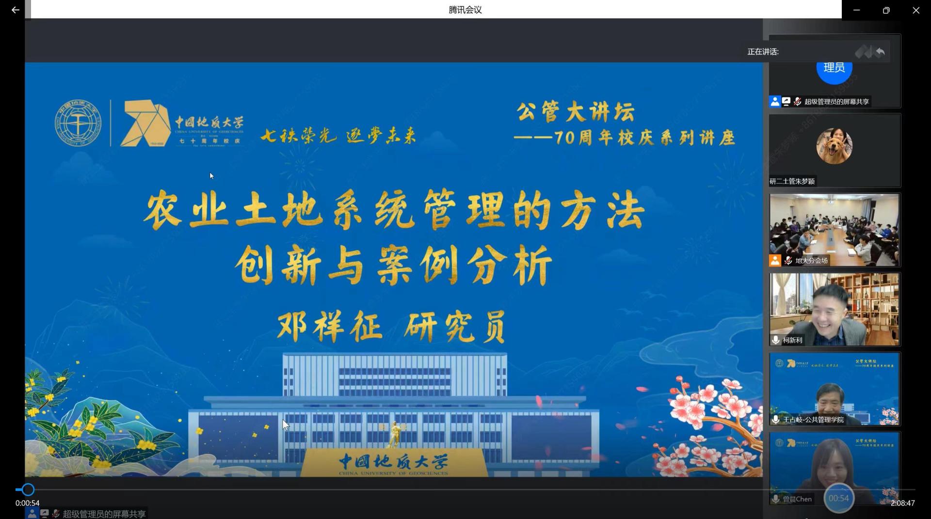 70周年华诞的诚挚祝贺。邓祥征研究员以气候变化与粮食安全问题作为切入点,围绕农业土地利用系统管理的方法与创新、理论与探讨、案例与分析、挑战及机遇、建议与展望五大部分内容展开本次报告。邓祥征研究员首先介绍了土地利用数据集成技术及模型在农业土地利用系统管理领域中的应用,通过丰富的学术成果及典型案例展示,介绍了团队在农业土地系统理论方法上的创新与突破,并指出农业土地利用系统管理理论创新的关键是从系统论和整体观角度来综合解析农业土地利用系统中的人-地关系,构建兼顾区域特色归纳与普适规律认识的中国特色农业土地系统理论与模型体系。随后,邓祥征研究员从管理的角度、尺度、维度、深度四个方面阐明了农业土地系统管理研究的挑战,并提出多视角多尺度系统综合的研究思路。最后,邓祥征研究员强调要推动多学科交叉,开展体现数据密集型科研新范式的创新研究,完善农业土地系统管理的相关理论与技术体系,服务“双碳”目标和粮食安全保障战略下的科学决策与管理实践。